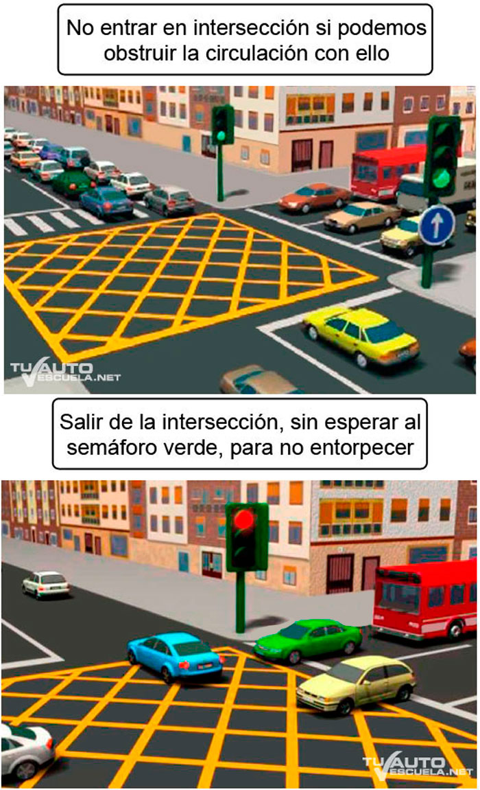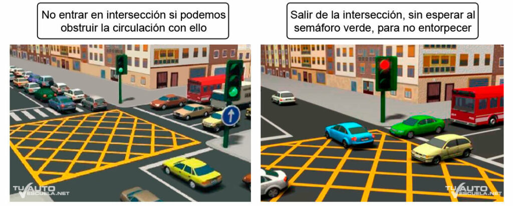 Si queda detenido en una intersección regulada por semáforo y su situación constituye obstáculo para la circulación deberá salir de aquélla sin esperar a que se permita la circulación en la dirección que se propone tomar, siempre que al hacerlo no entorpezca la marcha de los demás usuarios que avancen en el sentido permitido.