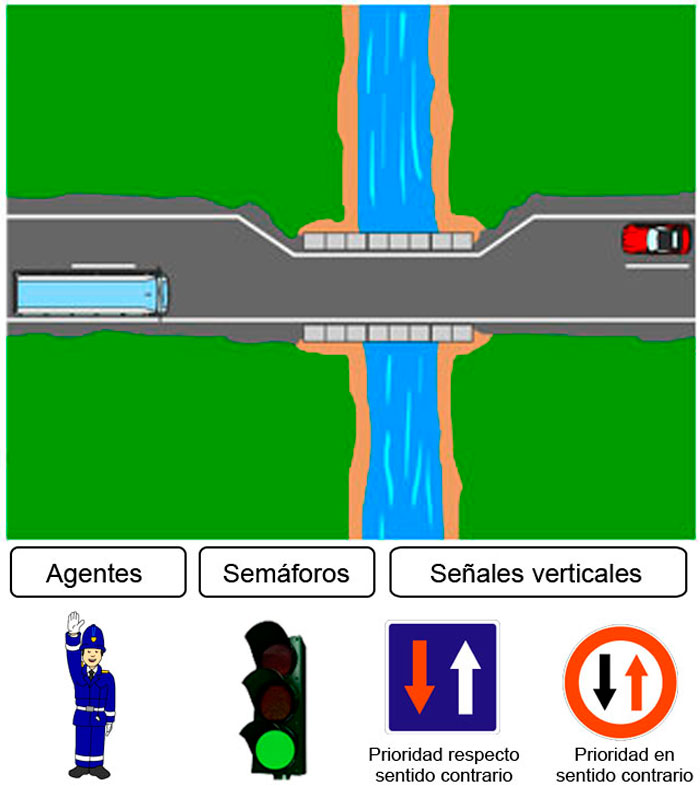La preferencia estará regulada mediante agentes, semáforos o señales verticales («Prioridad respecto al sentido contrario» o «Prioridad en sentido contrario»).