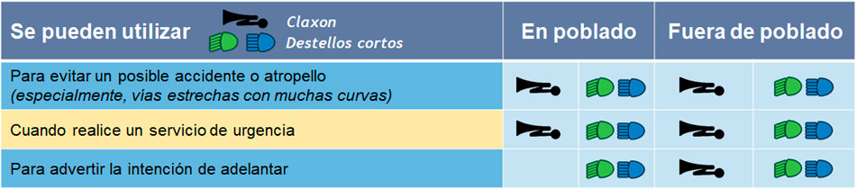Se pueden utilizar señales acústicas claxon bocina y señales con las luces luz de corto alcance largo alcance destellos cortos