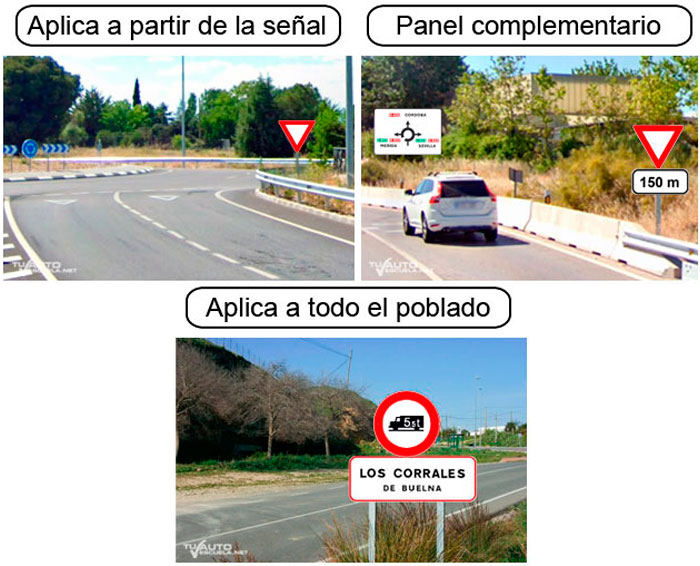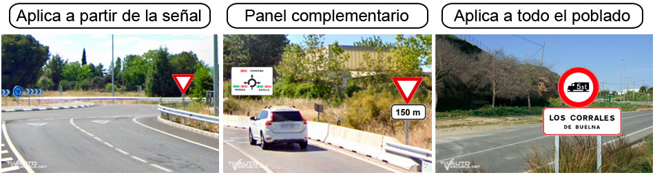 • Las señales de reglamentación colocadas al lado o en la vertical de una señal que indique el nombre del poblado significa que aplica a todo el poblado, excepto si se indicará otra reglamentación distinta mediante otras señales verticales en ciertos tramos de la vía (Si la señal es anterior o posterior a la señal de poblado solo aplicará a dicha travesía).