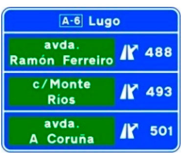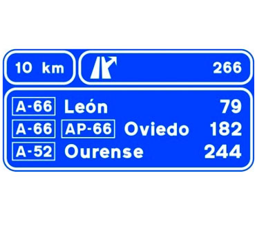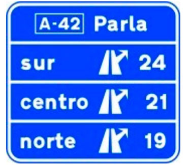 Indica las direcciones de los ramales de las dos salidas consecutivas en una autopista o una autovía. También indica la distancia a dichas salidas, los números o el número y letras de cada una de ellas.