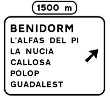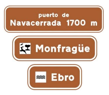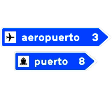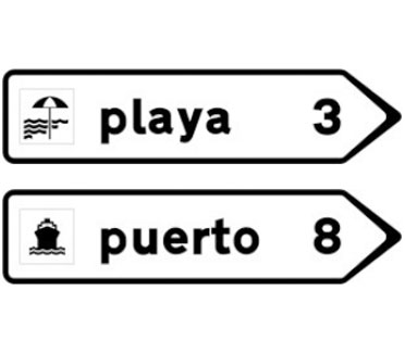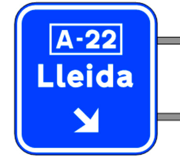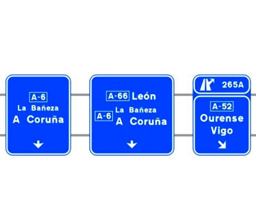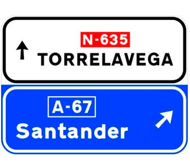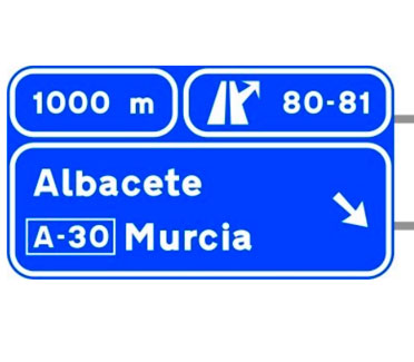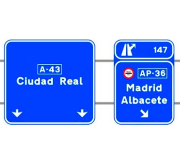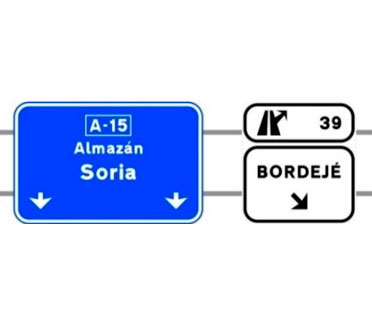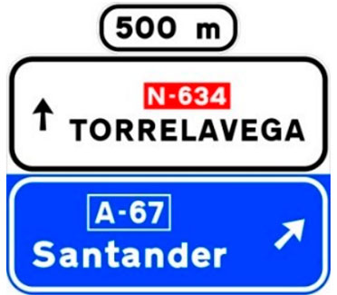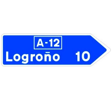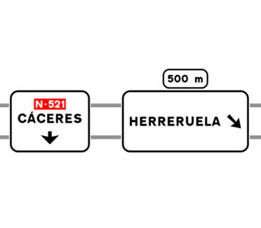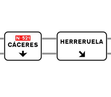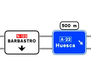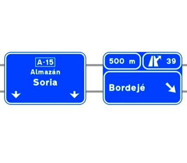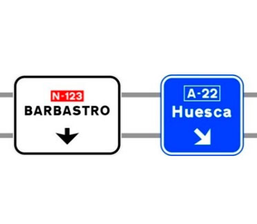 - Señales de preseñalización: Inclinadas (45º hacia arriba o abajo), colocadas junto al nombre del lugar indicado y de mayor tamaño.