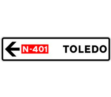 - Señales de dirección: Tantas flechas como carriles, apuntando hacia abajo, colocadas bajo el nombre del lugar indicado y de menor tamaño.