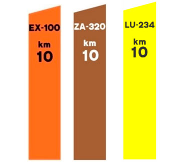 Indica el punto kilométrico de una carretera convencional cuya identificación aparece en la parte superior sobre el fondo de color que corresponda a la red de carreteras a la que pertenezca.