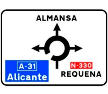 Indica, en una carretera convencional o una carretera multicarril, la dirección propia de la carretera por la que se circula y los destinos de las salidas del próximo nudo cuando estas dirigen hacia una autopista o una autovía, así como la distancia a la que se encuentran dichas salidas.