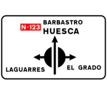 Indica, en una carretera convencional o una carretera multicarril, la dirección propia de la carretera por la que se circula y los destinos de la salida del próximo nudo cuando esta dirige hacia una autopista o una autovía, así como la distancia a la que se encuentra dicha salida.
