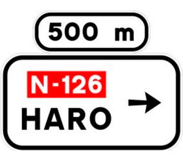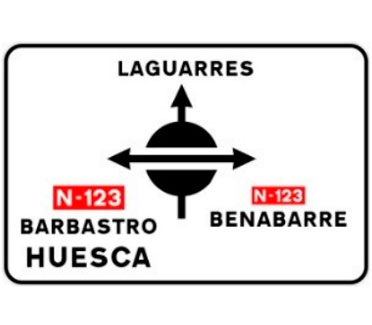 Indica, en una carretera convencional o una carretera multicarril, la dirección propia de la carretera por la que se circula y los destinos de la salida del próximo nudo cuando esta dirige hacia una carretera convencional o una carretera multicarril, así como la distancia a la que se encuentra dicha salida.
