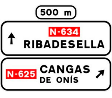 El cajetín situado dentro de la señal define la categoría y número de la carretera. Las cifras alineadas con los destinos indican la distancia existente a los mismos expresada en kilómetros.