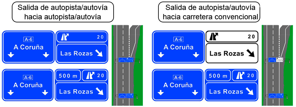 - Señales de preseñalización en autopista y autovía: llevan un panel indicando la distancia a que se encuentra la salida y el kilómetro en que está.